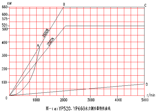 水力測功機(jī)的應(yīng)用范圍,可以從它的特性曲線上看出,見圖一(a)、(b)、(c)、(d)、(e)、(f)、(g)、(h)。特性曲線表示了測功機(jī)在不同轉(zhuǎn)速下所能吸收的功率范圍。