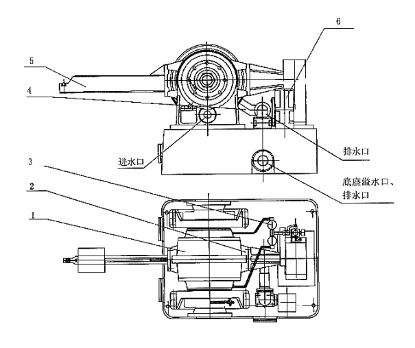圖二(b)Y880-S、Y1900-S、Y3300-S水力測功機(jī)外形示意圖 1、機(jī)體部件 2、測功部件 3、潤滑部件 4、進(jìn)排水部件 5、校正部件 6、自動調(diào)節(jié)裝置部件