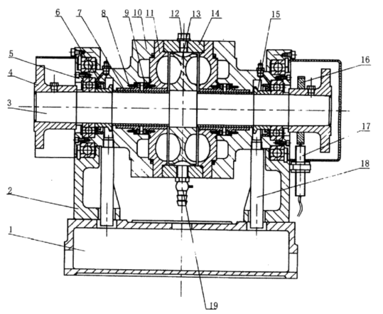 圖三(a)YP1900機(jī)體部件結(jié)構(gòu)示意圖 1、底座 2、左右軸承座 3、主軸部件 4、聯(lián)軸節(jié) 5、軸承壓板 6、骨架油封 7、軸套 8.9、雙金屬軸套 10、左右軸承外殼 11、左右側(cè)殼 12、螺塞 13、轉(zhuǎn)子 14、外殼 15、封水圈 16、測速齒輪 17、轉(zhuǎn)速傳感器 18、溢水管 19、旋塞